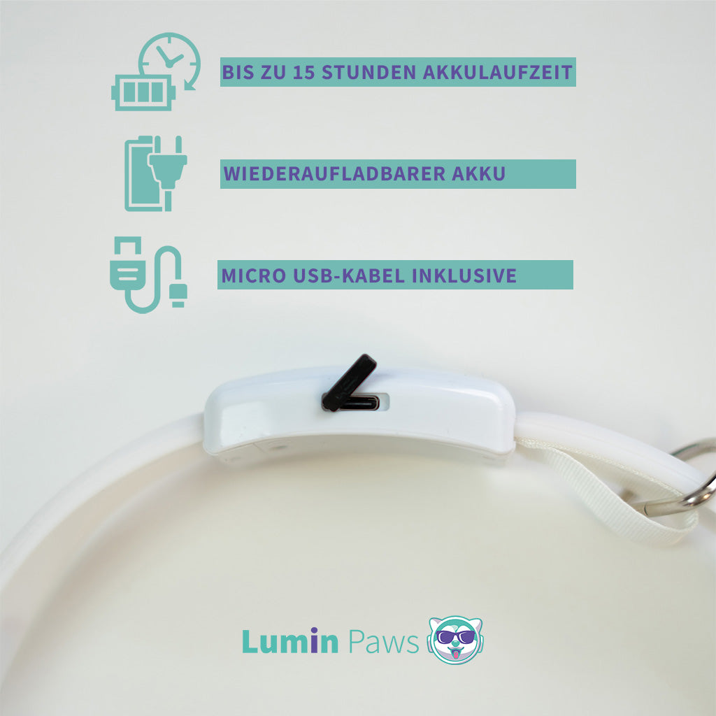 Mit einer beeindruckenden Akkulaufzeit von bis zu 15 Stunden ist der wiederaufladbare Akku des LuminHalo der perfekte Begleiter für ausgiebige Spaziergänge. Das mitgelieferte Micro-USB-Kabel macht das Aufladen einfach, und das wasserdichte Design nach IXP7 sorgt dafür, dass Ihr Hund in jedem Wetter leuchtet.